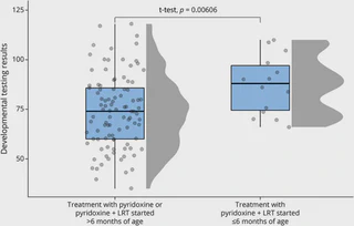 BACKGROUND AND OBJECTIVES: Pyridoxine-dependent epilepsy (PDE-ALDH7A1) is a developmental epileptic encephalopathy characterized by seizure improvement after pyridoxine supplementation. Adjunct lysine reduction therapies (LRTs) reduce the accumulation of putative neurotoxic metabolites with the goal to improve developmental outcomes. Our objective was to examine the association between treatment with LRTs and cognitive outcomes. METHODS: Participants were recruited from within the International Registry for Patients with Pyridoxine-Dependent Epilepsy from August 2014 through March 2021. The primary outcome was standardized developmental test scores associated with overall cognitive ability. The relationship between test scores and treatment was analyzed with multivariable linear regression using a mixed-effects model. A priori, we hypothesized that treatment in early infancy with pyridoxine and LRTs would result in a normal developmental outcome. A subanalysis was performed to evaluate the association between cognitive outcome and LRTs initiated in the first 6 months of life. RESULTS: A total of 112 test scores from 60 participants were available. On average, treatment with pyridoxine and LRTs was associated with a nonsignificant increase of 6.9 points (95% CI -2.7 to 16.5) on developmental testing compared with treatment with pyridoxine alone. For the subanalysis, a total of 14 developmental testing scores were available from 8 participants. On average, treatment with pyridoxine and LRTs in the first 6 months of life was associated with a significant increase of 21.9 points (95% CI 1.7-42.0) on developmental testing. DISCUSSION: Pyridoxine and LRTs at any age was associated with mild improvement in developmental testing, and treatment in early infancy was associated with a clinically significant increase in developmental test scores. These results provide insight into the mechanism of intellectual and developmental disability in PDE-ALDH7A1 and emphasize the importance of treatment in early infancy with both pyridoxine and LRTs. CLASSIFICATION OF EVIDENCE: This study provides Class IV evidence that in PDE-ALDH7A1, pyridoxine and LRTs compared with pyridoxine alone is not significantly associated with overall higher developmental testing scores, but treatment in the first 6 months of life is associated with significantly higher developmental testing scores.