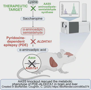 Pyridoxine-dependent epilepsy (PDE) due to recessive ALDH7A1 mutations is characterized by intractable epilepsy that is often unresponsive to antiseizure medications. Irrespective of pyridoxine (vitamin B6) supplementation and lysine reduction therapy, patients present severe residual neurocognitive deficits. We evaluated upstream inhibition of 2-aminoadipic semialdehyde synthase (AASS) as a novel therapeutic strategy to reduce the accumulating metabolites (α-aminoadipic semialdehyde, Δ1-piperideine-6-carboxylate, pipecolic acid, 6-oxo-pipecolic acid and 2S,6S-/2s,6R-oxopropylpiperidine-2-carboxylic acid) considered neurotoxic. We utilized an existing mouse knockout model of hyperlysinaemia (Aass-knockout) and generated a PDE model, a Aldh7a1 single knockout model via CRISPR/Cas (clustered regularly interspaced short palindromic repeats and CRISPR-associated protein) and generated the double-knockout Aass/Aldh7a1 mice. Next-generation metabolomics screening was performed to measure all known biomarkers in brain, liver and plasma of wild-type and mutant mice. Metabolomics confirmed the known metabolite markers for Aldh7a1-knockout and Aass knockout mice in all samples. The potentially neurotoxic metabolites (Δ1-piperideine-6-carboxylate, pipecolic acid, 6-oxo-pipecolic acid and 2S,6S-/2s,6R-oxopropylpiperidine-2-carboxylic acid) significantly decreased in double-knockout Aass/Aldh7a1 mice brain and liver tissues compared to Aldh7a1-knockout mice. Plasma analysis revealed a significant reduction of known biomarkers, suggesting a reliable monitoring option in human patients. We demonstrate the first mammalian evidence that AASS inhibition is a viable strategy to rescue abnormal brain metabolism associated with PDE. This may target the intellectual disability and neurologic deficits caused by persistent lysine catabolic-related neurotoxicity despite adequate vitamin B6 supplementation.